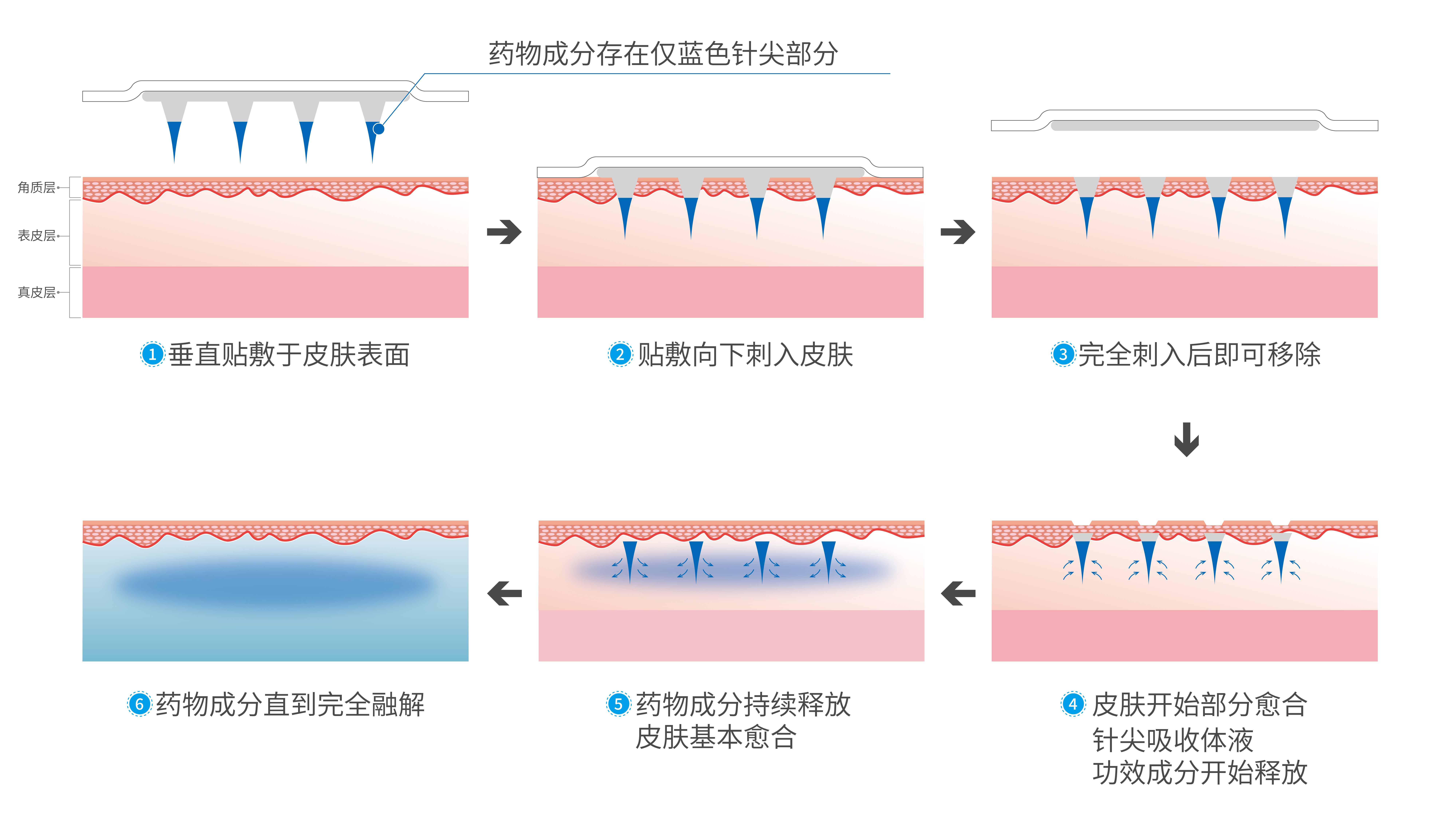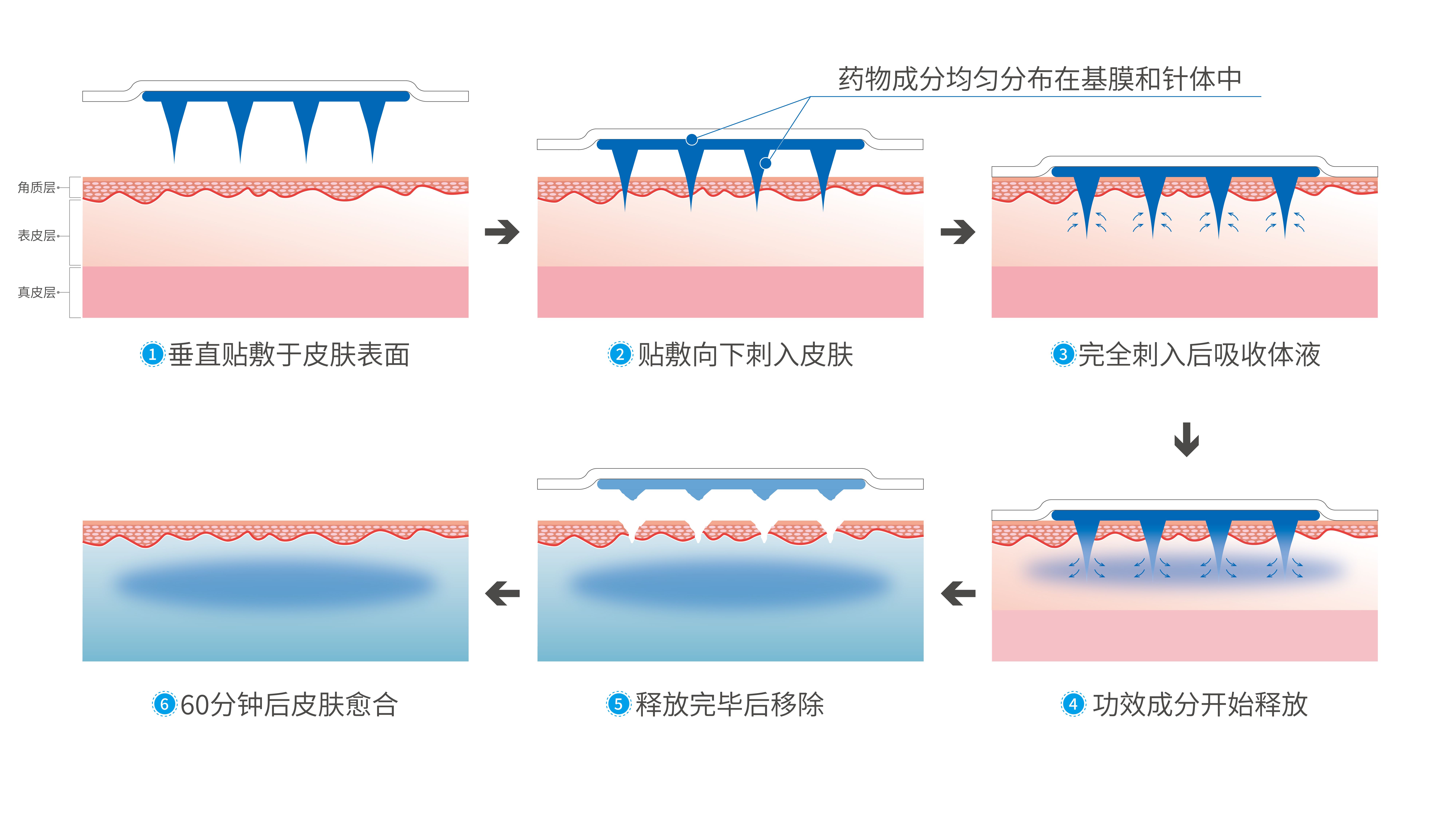 無痛微創(chuàng),依從性高 微針高度小于450微米,刺穿皮膚角質(zhì)層到達(dá)到表皮層吸收體液溶解釋放,不會觸及到真皮層的神經(jīng)末梢和毛細(xì)血管,患者不會感覺到疼痛也不會出血,無痛微創(chuàng)患者依從性高。 -